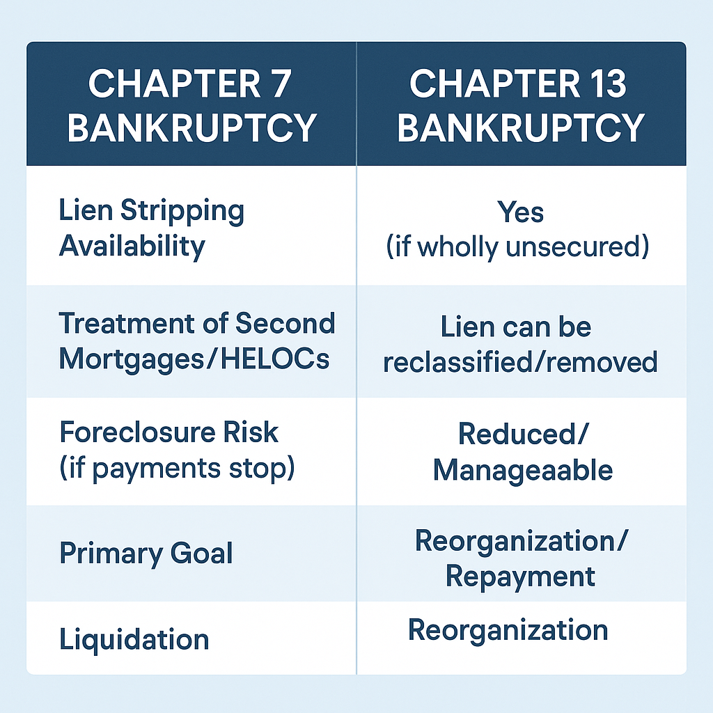 - Lien Stripping: If you have a second or third mortgage (or other junior liens) on your home, and the value of your home is less than what you owe on your first mortgage, Chapter 13 may allow you to “strip off” those junior liens. This means they are reclassified as unsecured debt and can be discharged at the end of your plan, just like credit card debt.